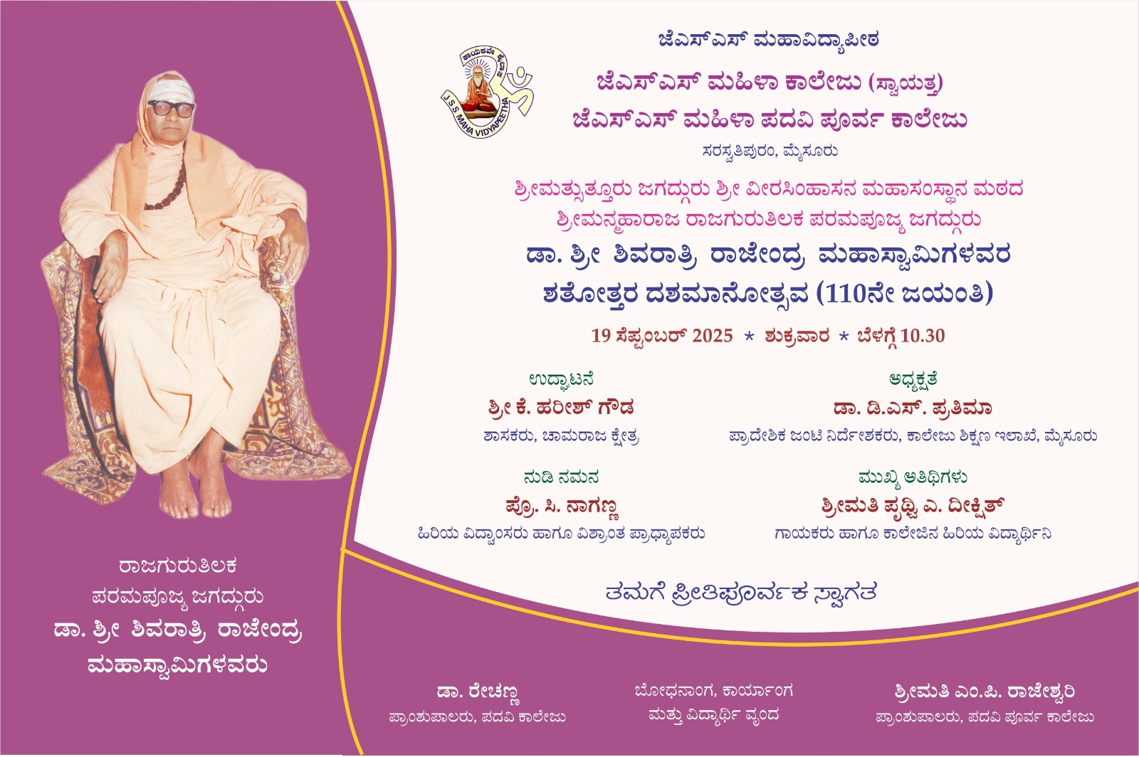 Since its inception with the blessings of His Holiness Jagadguru Dr Shri Shri Shivarathri Rajendra Mahaswamiji the college devoted to empower the women folk in all aspects. Not surprisingly, the college has been elevated to the extent of catering the needs of the students with the support of dedicated teaching as well as non-teaching personnel. The college has been serving not only to promote at the fundamental level but also functioning as a primary vehicle for the dissemination and maintainance of cultural norms, customs and traditions. Infact education is expected to promote the values of democracy, egalitarian and social justice, good personal, social, moral and spiritual values and the values of tolerance for other's views, languages and religions. Education must necessarily emphasize excellence, productivity and the capacity to tackle the problem. The college is striving to prepare the younger generation to achive a quality of life which is desirable, feasible and sustainable and to lead a useful and purposeful life. It is imparting various programmes based on the needs and aspiration of younger generation. I would like to extend my sincere thanks to our JSS Mahavidyapeetha for its whole hearted support in making the Pre-University Education easily accessible to the students from all social and economic background. The college is making sincere efforts to bring co-curricular activities under a single roof as it serves as subservient to the main purpose that is classroom learning.
